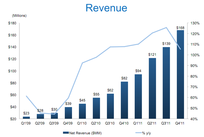 Non-GAAP net income for the fourth quarter was $13.3 million, compared to $5.2 million for the fourth quarter of 2010. For the full year 2011, revenue increased 115% to $522.2 million from $243.1 million.