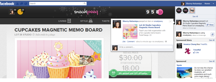 At launch in May, Sneakpeeq would actually drop the price everytime you took a “Peeq” at the price of an item, with the discount available only until someone else bought the item. The company has pivoted slightly into more of an action-based shopping network. So basically, by Peeqingm buying, sharing items on Facebook, and more, you earn badges on Sneakpeeq, which can then be applied for discounts on an items.