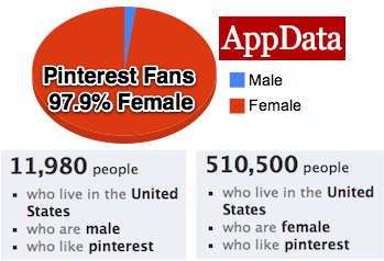 OMG. Pinterest now has over 10.4 million registered users, 9 million monthly Facebook-connected users, and 2 million daily Facebook users, according to Inside Network’s AppData tracking service. With gorgeous photography, and links to shopping sites, Pinterest is becoming an obsession for flocks of women. And they’re not afraid to show it, I mean, Like it. AppData and Facebook’s advertising tool show that over 97% of Pinterest’s Facebook fans are women.