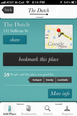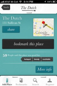 Essentially, Matchbook is like Foursquare or Yelp, minus the check-ins, reviews, and social networking — just a simple bookmarking feature for favorite places. While this may sound a bit too pared-down for the taste of tech enthusiasts, you have to remember that there are a lot of people out there who don’t use Foursquare, who aren’t comfortable or used to checking-in at every place they visit, or voraciously social networking while on the go. So Matchbook offers users the ability to organize all of their to-dos by neighborhood on a map layout, search bookmarks for date spots, find the best of those bookmarks, along with top places flagged by other users — to name a few.
