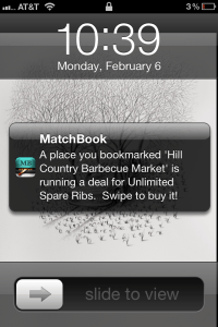 Matchbook’s new intent-based deals product alerts users when a place they have bookmarked is running a deal on sites like Groupon, LivingSocial, and Gilt City, reminding users of their favorite venues, through user-specific offerings at discounted prices. Naturally, if, for example, LivingSocial happens to run a deal for that new restaurant in your neighborhood you’ve been meaning to try, Matchbook will send users a notification allowing them to buy the coupon. The more venues a user bookmarks, the more useful and targeted the service’s deals become.