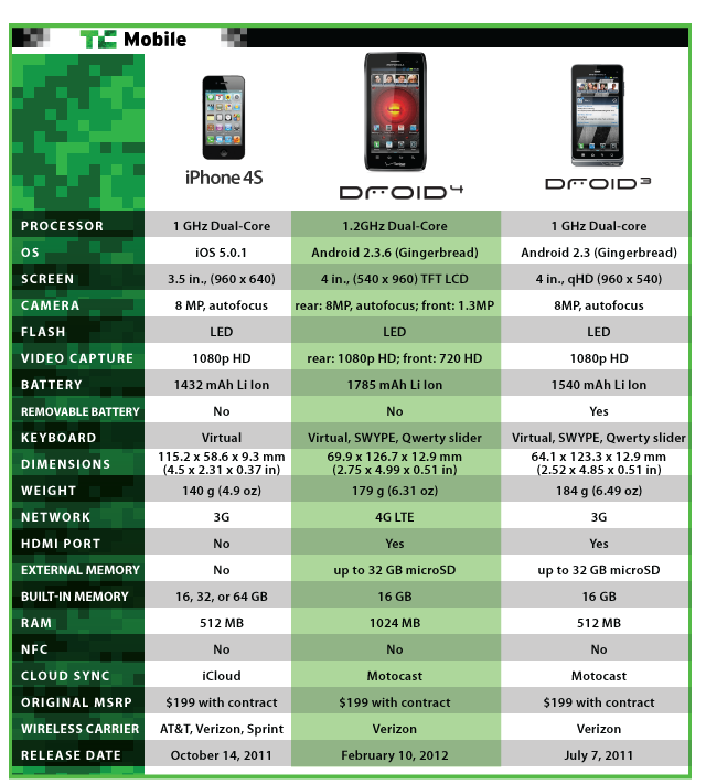 As you’ll notice quite quickly from this infographic, we’re pitting the Droid 4 against its predecessor, the Droid 3, along with the iPhone 4S. For anyone who isn’t a die-hard Android fan, the iPhone 4S usually comes into the equation when it comes time to upgrade hardware. Since many of our reviews will be of Android devices (and Windows Phone) rather than iOS, we wanted to make sure to let you visualize the differences between the handset we’re reviewing and its biggest competitors.