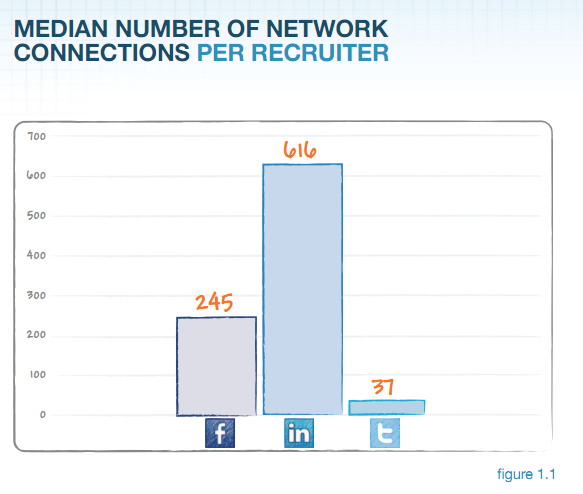 According to the report, 48 percent of recruiters use LinkedIn exclusively. These recruiters have an average of 661 connections, and don’t leverage the other two networks for social recruiting. From there, recruiters use Twitter more than Facebook. Despite the fact that recruiters have fewer connections on Twitter (37 followers on average), 19 percent are connected to both LinkedIn and Twitter, while only 10 percent are connected to both LinkedIn and Facebook (245 friends on average).