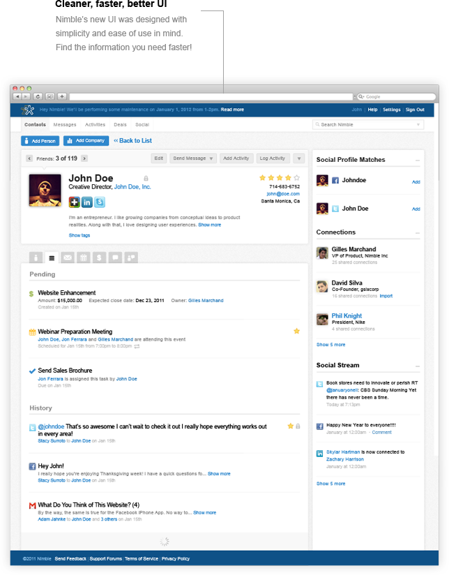 Whereas old-school CRM systems stick to sales lead forecasting and management platforms that require users to BCC and CC messages, duplicate activities to link them to contacts, etc., Nimble offered the ability to automatically connect your conversations and activities — emails, social conversations, and calendars — to the people you’re having them with. Rocket science? No. But still not really done well yet.