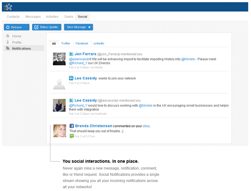 What does that mean? Well, for starters, Nimble now offers unified social notifications all in one place. In the old model, businesses (and individuals) are stuck having to switch between windows, tabs, or apps to stay on top of their messages, notifications, likes, and requests on Twitter, Facebook, LinkedIn, etc. Nimble puts your business’ social accounts into one stream, allowing you to follow, respond, engage from a single dashboard.