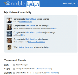 And, to give your business’ marketing and sales teams an idea of where to start engaging each day, Nimble now sends out an email “full of engagement opportunities” — in other words, a hit list of the most important news from your social networks, like friends, colleagues and social media connections changing jobs, your upcoming meetings, and, yes, even birthday notifications. The idea is to present businesses (and individuals) with a whole new slew of opportunities to reach out to customers and contacts for some organic engagement. This is great because it’s one piece of answering the question — “who should I be talking to that I’m not?” — important to both busy/lazy networkers as well as sales/marketing teams.