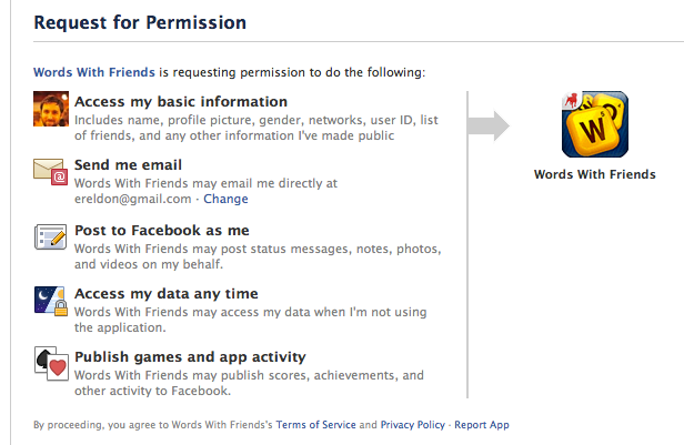 If you click to install an app on Facebook, its permissions dialog tells you explicitly that you’re giving the app access to your friends lists (not friends’ emails and phone numbers) by default. If you don’t want to share your friends lists with the app, you don’t install it. If an app wants to do other things, like automatically share back to Facebook on behalf of a user, it needs to ask for additional approval within another permissions interface. If a developers wants to ask any user to contact friends within the app — for inviting them to play a game or whatever — it requires them to do so separately later on within the app.