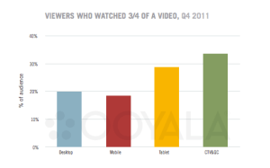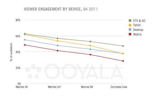 As we learned in Q3, the rabid adoption of mobile devices has been leading to increased engagement with online video. Not only that, but connected TVs are really beginning to make waves, Google TV in particular. Ooyala’s report found that video plays on tablets, mobile devices, and connected TVs nearly doubled in the fourth quarter (from Q3).