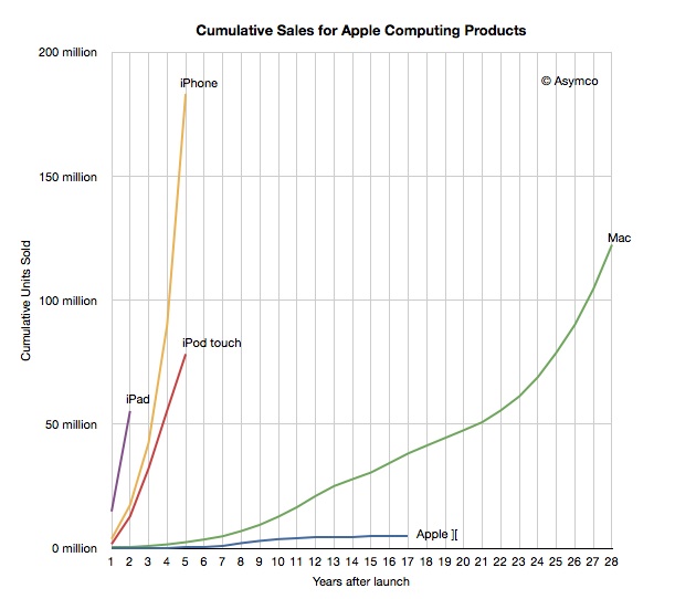 If anyone has any doubt that iPhones, iPads and other iOS devices are the future of Apple, just take a look at the chart above from Asymco. It shows all iOS products sold cumulatively versus all OS X products ever sold (Macs) over the past 28 years. The iPhone has only been around for four years, but in that time more iPhones have been sold than all the Macs ever sold in Apple’s entire history.