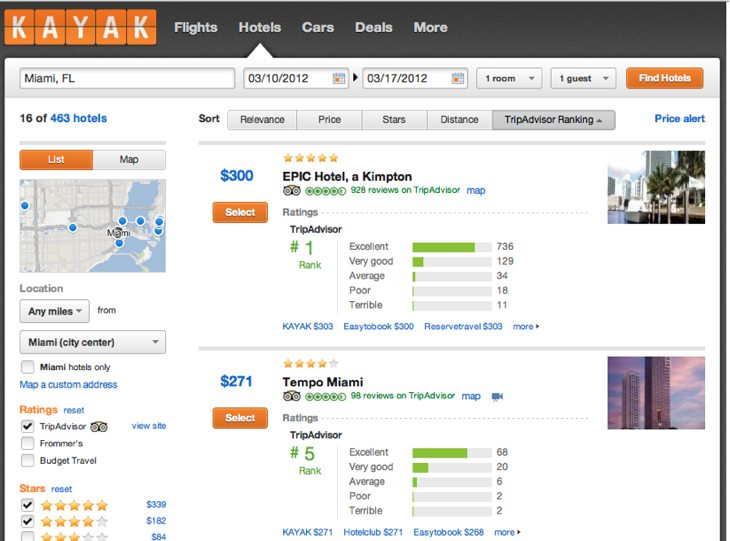 Considering TripAdvisor’s place as the leader in user-generated reviews in the travel space, this is a big content win for Kayak. After a search for what hotels are available for a given trip on Kayak, I tend to go to TripAdvisor afterwards to checkout which hotels had the best reviews in my price range. And Kayak says that most of its users exhibit similar behavior as well. Clearly, by incorporating these reviews in search results, Kayak is saving users time.