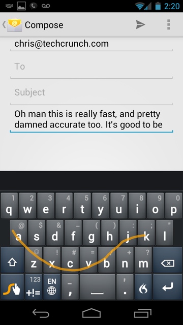 Aside from being able to slip and slide your way through a few lengthy missives, Ice Cream Sandwich users can also take Swype’s Nuance-powered voice dictation for a spin. Some may scoff at the notion of abandoning Google’s impressive speech-to-text functionality, but Swype’s alternative is no slouch — it isn’t as downright fast as Google’s implementation but a few minutes of testing made it seem a bit more accurate.