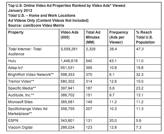 Americans viewed 5.6 billion video ads in January, with Hulu delivering the highest number of video ad impressions at 1.4 billion. Adap.tv ranked second overall (and highest among video ad exchanges/networks) with 652 million ad views, followed by BrightRoll Video Network with 598 million, Tremor Video with 580 million and Specific Media with 398 million.