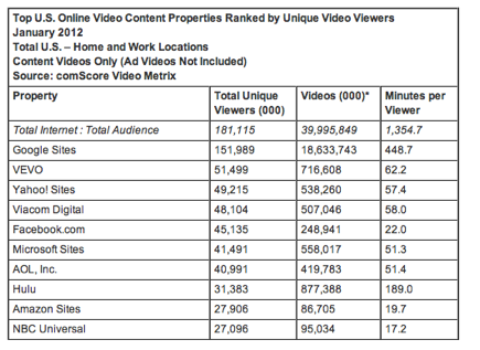 comScore just released its monthly U.S. online video data, and while viewership dipped slightly in January 2012 (from December), long-form video content views are on the rise. According to comScore, 181 million U.S. Internet users watched nearly 40 billion videos of online video content in January, compared to 182 million users who viewed 43.5 billion videos in December. And 84.4 percent of the U.S. Internet audience viewed online video in January. The duration of the average online content video was 6.1 minutes (up from 5.8 minutes in December), while the average online video ad was 0.4 minutes.