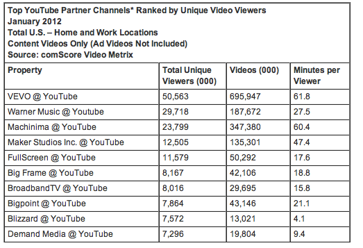 Specifically on YouTube, video music channels VEVO (50.6 million viewers) and Warner Music (29.7 million viewers) were the most popular amongst viewers. Gaming channel Machinima ranked third with 23.8 million viewers, followed by Maker Studios with 12.5 million, FullScreen with 11.6 million and Big Frame with 8.2 million. Among the top 10 YouTube partners, VEVO demonstrated the highest engagement (62 minutes per viewer) and highest number of videos viewed (696 million), while Machinima exhibited the second highest engagement (60 minutes per viewer) and number of videos viewed (347 million).