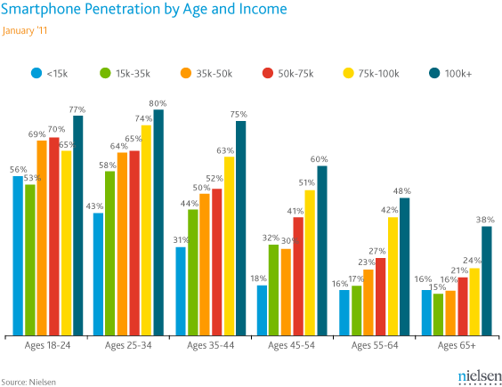 Nielsen’s own analysis didn’t concentrate on this aspect of the data, instead focusing on the overall youth-owning-smartphones trend. Or the fact that when both age and income are taken into account, older subscribers with higher incomes are more likely to have a smartphone (i.e., those aged 55-64 making over 100K are as likely to own as those 35-44 making 35-75K).