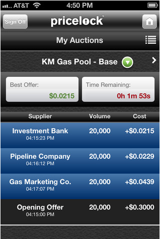 The Pricelock Mobile app extends the auction into the pocket of the buyer or seller, which is meant to improve the speed and efficiency of how energy is purchased. The app notifies suppliers of upcoming auctions and lets them watch how their bids are doing in real-time.