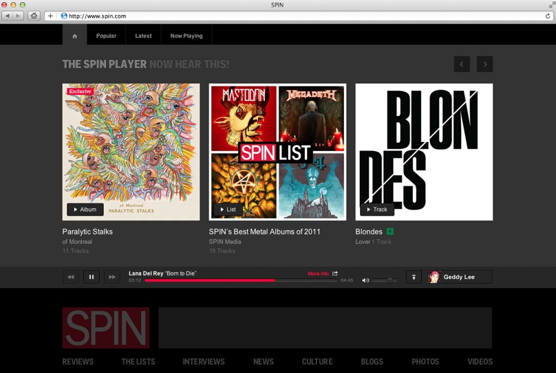 Music magazines are getting hit with a double whammy in the age of digital media. Like all print publications, their audience is going online—but so is the music. Why read about a new album when you can just listen to it on Spotify? Spin magazine is responding by shifting its focus online in a big way with a major redesign that literally puts the music first with a music player right at the top.