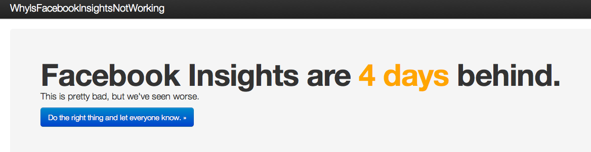 Yes, WhyIsFacebookInsightsNotworking.com doesn’t actually try to answer what its name would seem to indicate. Only Facebook engineers working on the tool know exactly why Insights is not functioning at any given time, after all, and they are probably busy working to fix it instead of dealing with questions.