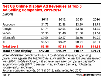 The social network had the highest online ad sales of any company in the U.S. last year, at $1.73 billion. But that was a mere $200 million or so above Google. This year, eMarketer expects a similar story, with Facebook bringing in $2.58 billion versus Google’s $2.54 billion. Things change in 2013 and 2014, further off from what the data can tell us accurately.