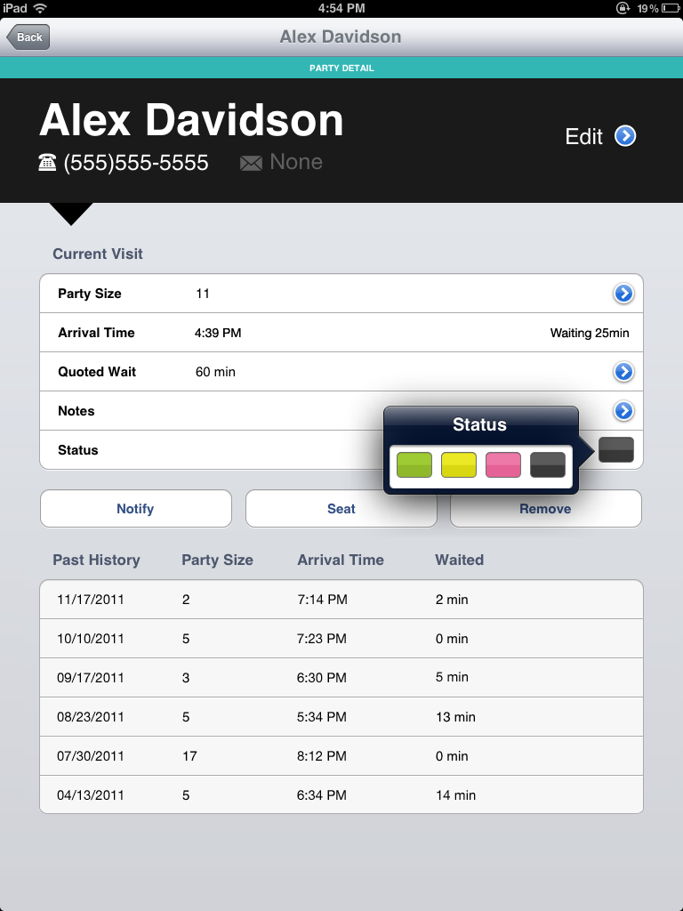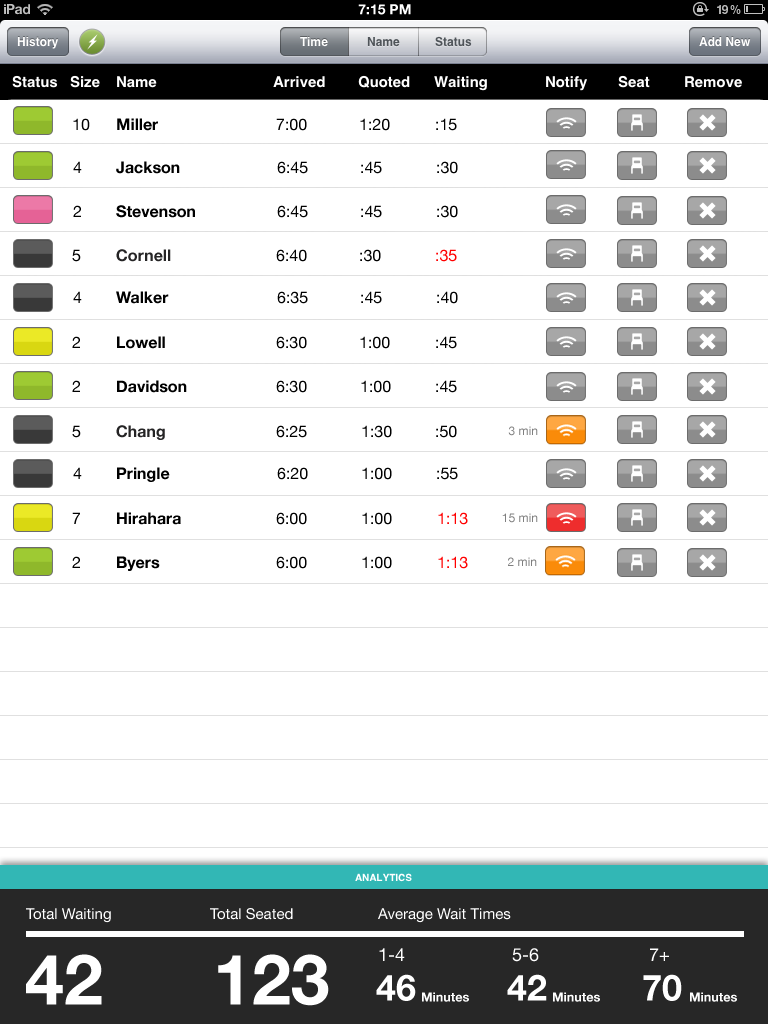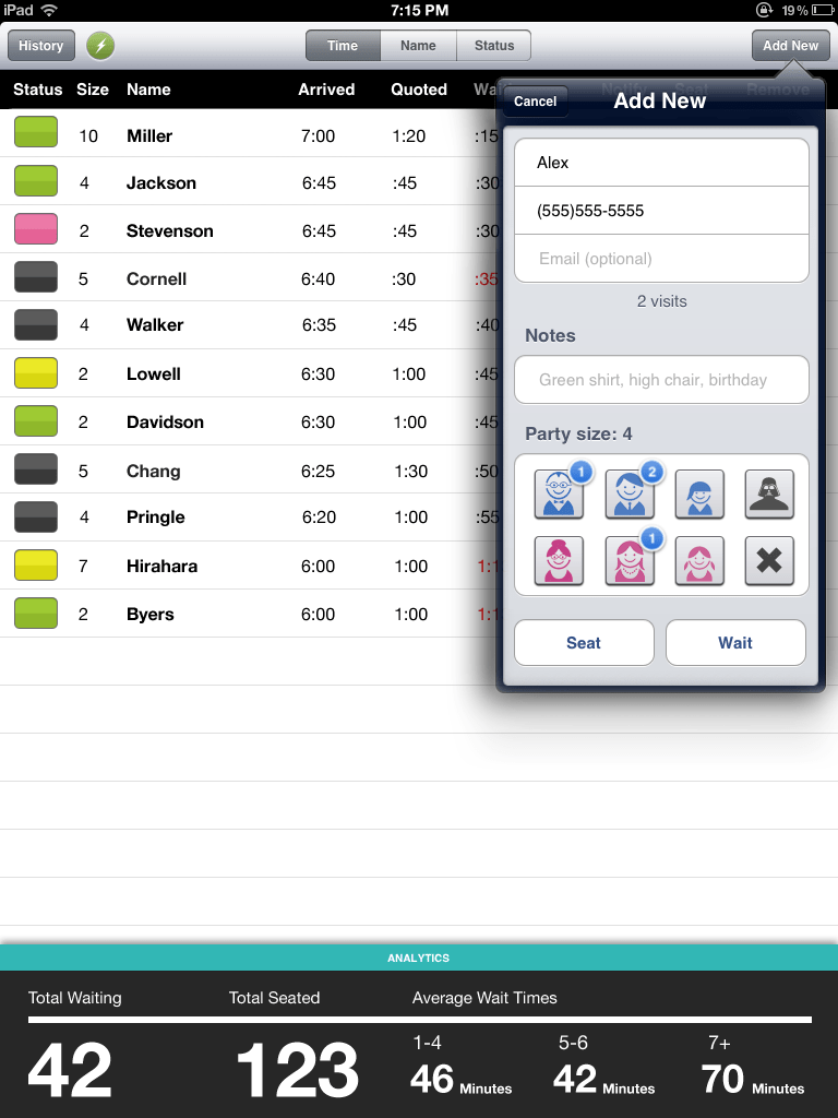 The app also allows the restaurant to easily manage parties – adding, seating and removing them as necessary – just by pushing a button. To add walk-up customers, NoshList users simply enter in a name, phone number and tap a button for the party size. There are even different icons for gender and age groups (i.e., blue for boys, pink for girls, and an icon that looks sort of like Darth Vader for “unknown”).