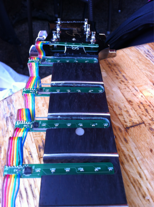 The project uses an open source Arduino board and open source software to drive the lights and/or create an active light show for guitarists who don’t need TAB help and are instead interested in looking like Peter Frampton in the year 2020.
