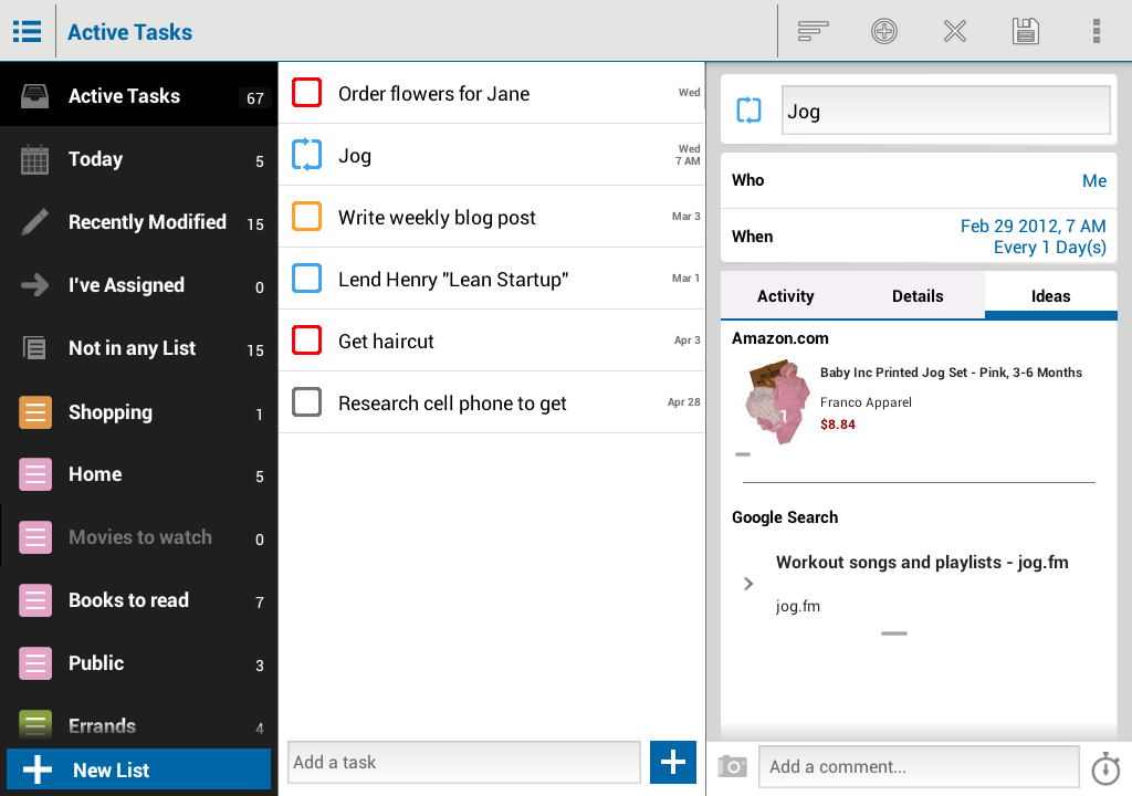 Astrid is also now offering users the ability to view suggestions/ideas through integrated search with Amazon and Google, for the simple reason that many of us start their tasks with a Google search before popping over to Amazon to make a purchase. Again, in case it’s unclear, what Astrid is trying to do here is match to-dos and tasks with products and services that help get them done, a la TaskRabbit and Amazon. Paris says that he thinks this can be a win-win for both eCommerce retailers (and startups like TaskRabbit), as Astrid’s users are inherently people with full plates, looking to manage their tasks and lighten the loads. And eCommerce sites now get the benefit of getting traffic from people that are more likely to buy.