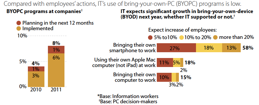 BYOD programs, meanwhile, are still low. Only 6 percent of companies have BYOPC programs in place. 58 percent expect growth in employees bringing smartphones to work in the next 12 months, whether BYOD-supported or not.