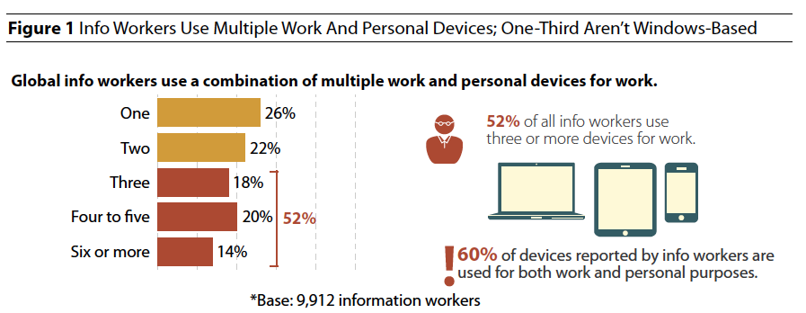 Info workers reported using 60 percent of all their PCs and mobile devices for both personal and business use, with only 14 percent used just for work, and 26 percent for personal purposes. The numbers indicate a further blurring of the boundaries between personal time, and time spent working.