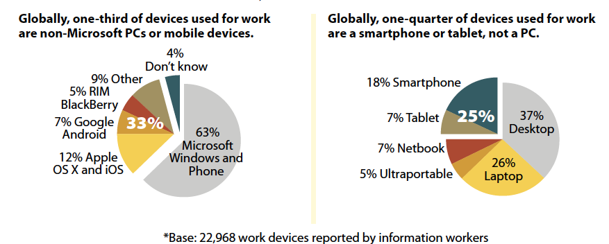 So what kinds of devices are these? Well, one-third (33 percent) of all those reported to be in use were non-Microsoft, and one-quarter of them were mobile. (Forrester counts tablets as “mobile,” for what it’s worth).