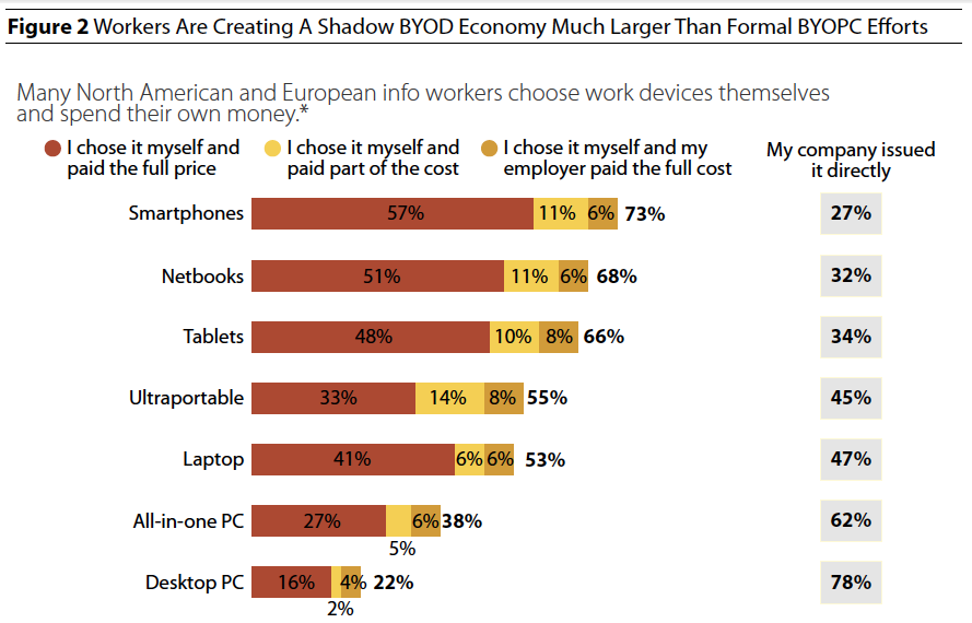 Employees today are bringing their own devices largely outside of BYOD programs, Gillett says. While 73 percent of workers pick their own phone, 53 percent their own laptop, 22 percent their own desktop, and 66 percent their own tablet, significant numbers of workers report paying for the devices themselves. In the case of smartphones, for example, 57 percent report paying the full price for the device themselves, and 48 percent report paying full price for their own tablet.