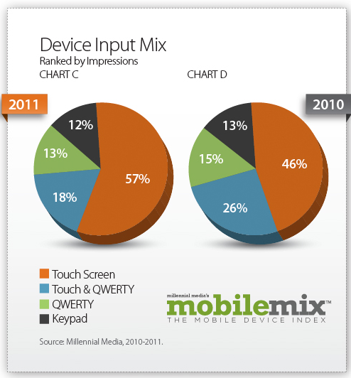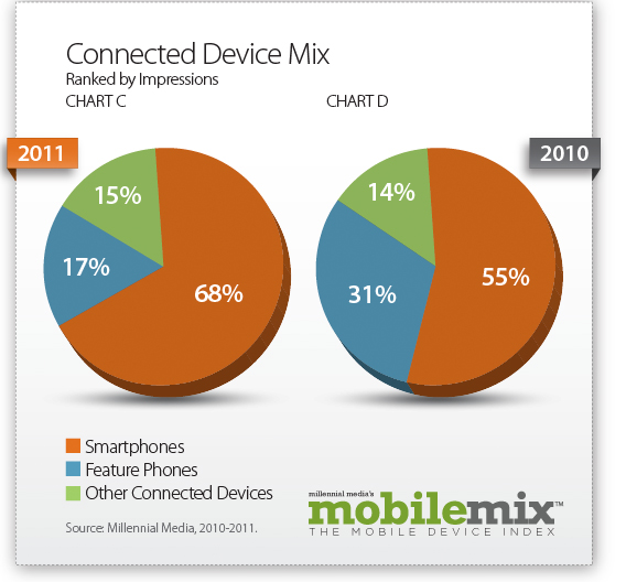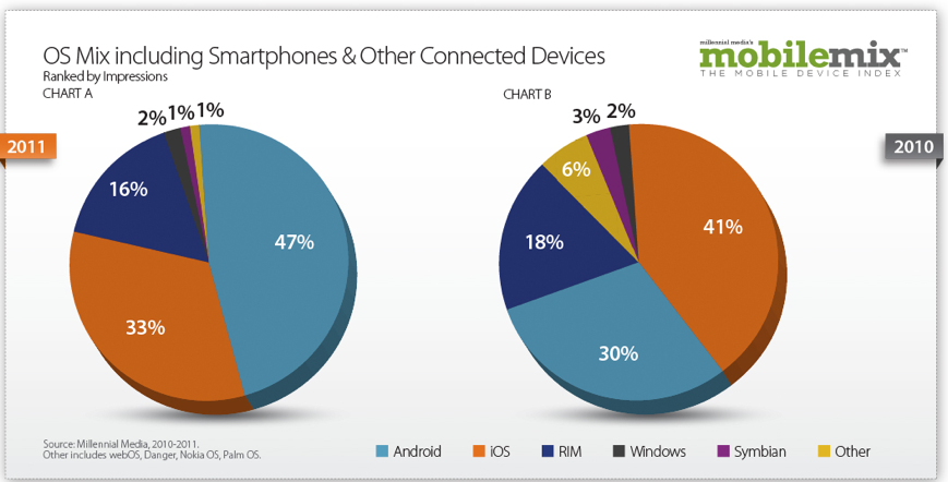 After filing its S-1 for an IPO, Millennial Media, the largest independent ad network, is releasing a yearly report on performance of smartphone operating systems on its network in 2011. Continuing its growth as a platform on Millennial’s network, Android impressions grew 504 percent year-over-year.