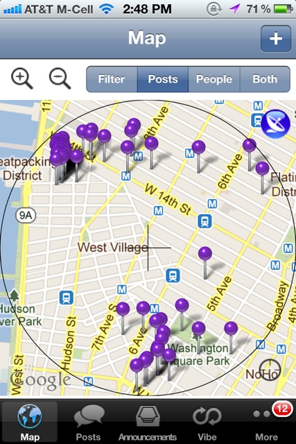 Back during the heyday of #OccupyWallStreet in New York City (before winter dispersed most of the protestors there), an iPhone app called Vibe became popular among that community. It allows people to post messages, photos, and videos within a geo-fenced radius—everything from a “whisper” (visible only to people within 165 feet) to a “bellow” (visible worldwide). The messages can be set to expire and users can post with a pseudonym or link the app to their Twitter account. Other users can respond to create a threaded conversation.