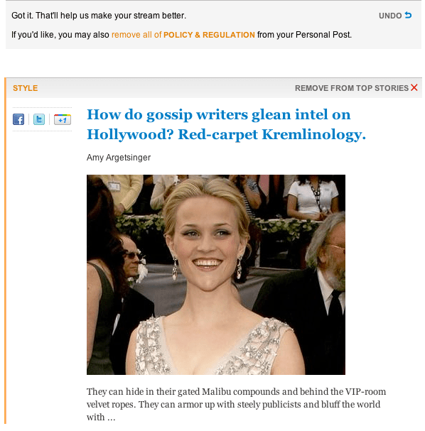 That experiment is called Personal Post, and it’s available at personal.washingtonpost.com, where you’ll see a river of content that you can customize. If you’re already a member at WashingtonPost.com, you can log in and the site will offer headlines tailored to match your previous activity. If not, you can choose from The Post’s “starter streams,” like National Pulse, Washington Life, and Sports Nut.