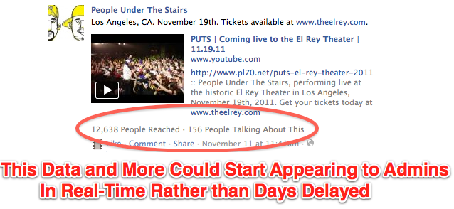 Right now, the only metrics that are reported in near real-time are for offsite social plugins, and Likes, comments, and shares on a Page’s posts to the news feed. It can be 12 hours to more than 2 days before Page posts start displaying reach and people talking about this to admins, and before admins can check Insights for dozens of other metrics such as link clicks, and impressions of the post driven by Sponsored Story ads. By then it may be too late to effectively launch a new ad campaign or delete and repost a link update with a different headline, caption, or image.
