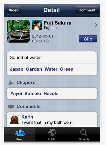 Users can shoot six-second videos, upload the them to Gnzo, and share them with friends on Gnzo itself, Twitter or Facebook in just a few seconds. It’s also possible to tag videos, leave comments, “clip” videos you like, or follow what friends are posting (there is also a “public” screen where new videos are getting uploaded constantly).