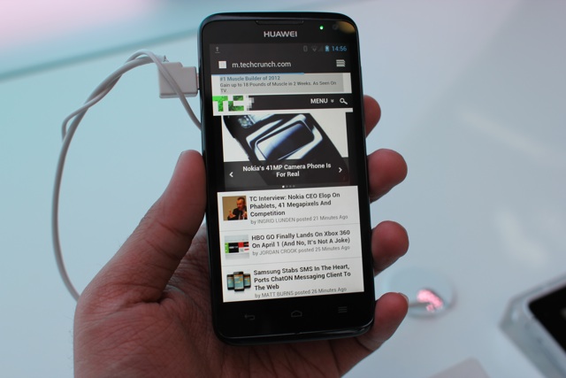 The D Quad is a handsome, understated device, and it feels great too: the device’s back is covered in a slick, soft-touch plastic, and it fits nicely in my hand despite its 4.5-inch 720p display. It’s not even close to being the most ostentatious phone I’ve seen in my days in Barcelona, but Huawei’s design team livened things up a smidge with some red highlights along the device’s rear. It’s clear that in their push for U.S. and global relevance, they’re making sure that the fit and finish of their devices is up to snuff — good on them.