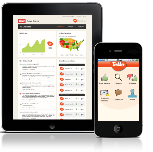 On the consumer side, Tello is a free web and mobile service that aggregates ratings for businesses from across the web and allows users to post comments about their experience at a business. Users can provide feedback on specific employees, recommend an employee and share a positive or negative story about them. Via iPhone and Android apps, users can select a specific business, choose an employee at the business and rate the service with a thumbs up or a thumbs down.