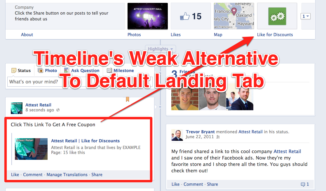 Amongst the beautiful covers and pinned posts, there’s one disadvantage of the new Facebook Timeline for Pages redesign. Pages can no longer display one of their custom applications as their default landing tab that non-fans first see when they visit. This powerful marketing feature let Pages set up a welcome app that teased special content like contests or coupons, but required users to Like the Page for access.