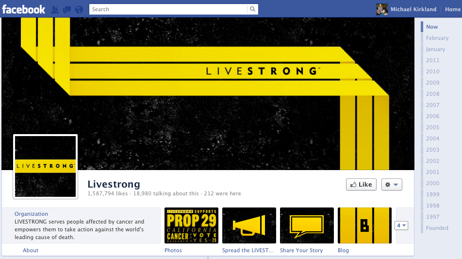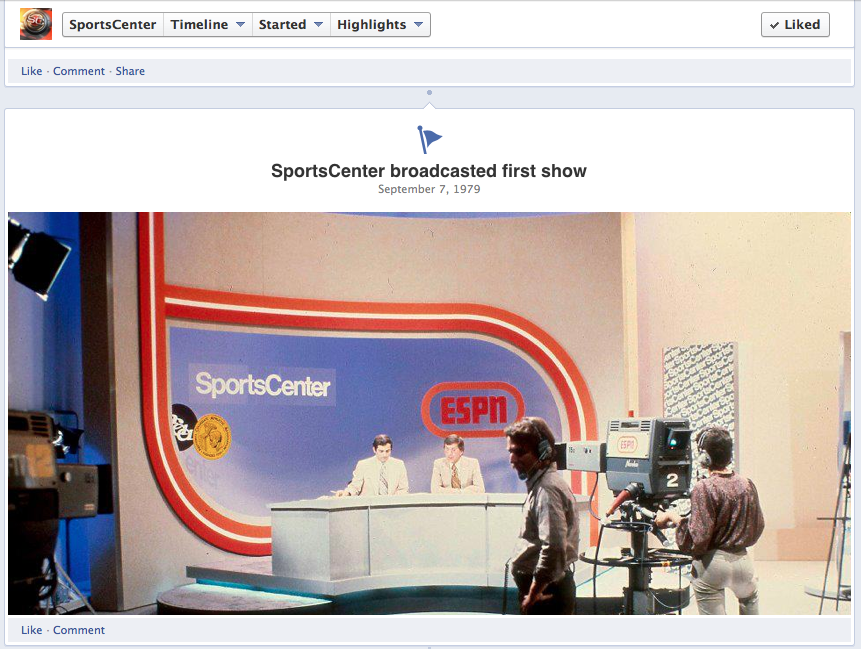 Brands with a long, colorful history have the most to gain from Timeline. They’ll be able to insert updates, links, media, and milestones as far back as their founding. For example, Livestrong’s Page features photos and videos from Lance Armstrong’s fight with cancer in the 1990s, while ESPN displays a photo from its first broadcast in 1979.