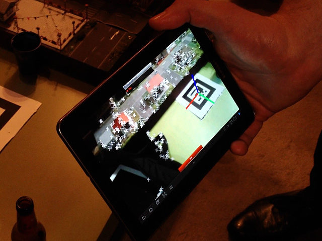 I shot 3 different videos yesterday that describe Metaio’s new Creator Mobile software which allows you map real environments to hold augmented, digital content. Of all those videos (shot in well-lit, more stabilized sound environments) the best example to describe the system, of course, shows up at an off site event in a loud, dark room. Yet again, I busted out the “Rogue Ghetto Cam” (aka iPhone 4S) to capture the content. My apologies for the shakiness.