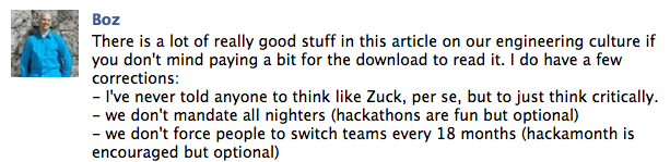 Going a little overboard, Fortune write that Facebook “holds bootcamps to teach engineers to “think like Zuck,” forces people to change projects midstream, and even mandates all-nighters.” That’s not completely accurate, Bosworth wrote on Facebook this morning: