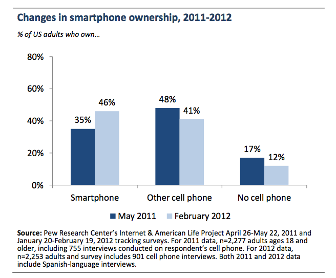 As of February 2012, 46 percent of the 2,253 adults surveyed said they are now smartphone owners — growing 11 percent in the last nine months, while 41 percent of adults own a device that is not a smartphone.