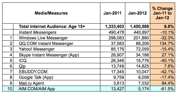 Worldwide, where AOL ranks in 10th place among IM providers, there are some interesting pockets of growth, but they are mainly outside of the U.S. and in China and Russia, says comScore, which provided us with comparative numbers between January 2011 and January 2012: