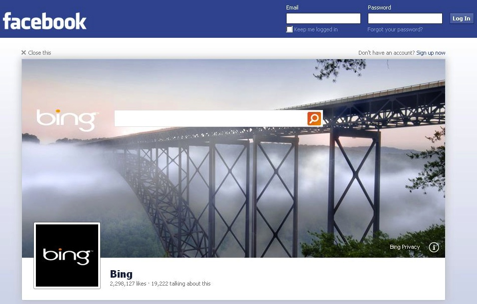 When Singh tried clicking the ‘close this’ button in the top left, he was shown the traditional Facebook logout page. There’s no information available right now about how Facebook would decide whether to show a Page post Sponsored Story ad or the Bing experience, though the latter could appear to users who don’t meet ad targeting critieria.