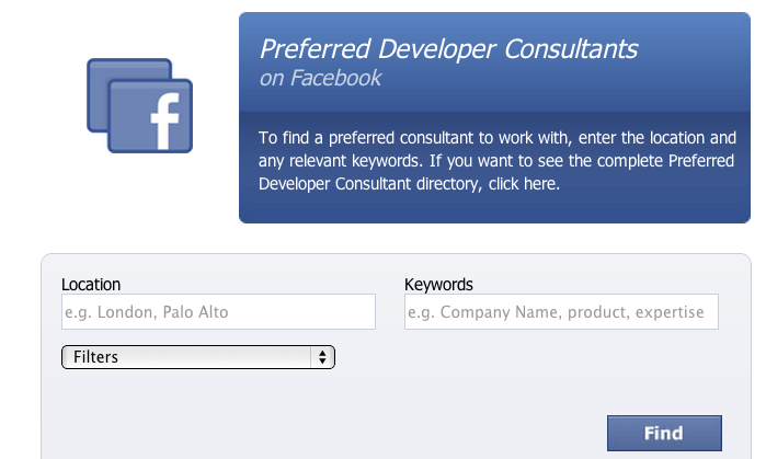 Previously, brands trying to discover relevant Facebook marketing services had to use the somewhat clumsy Preferred Developer Consultant lookup tool for Page management and marketing services shown below, or comb through the list of Ads API tools and services vendors. There was no official place for Insights vendors like PageLever or EdgeRank Checker, or custom campaign app development services.