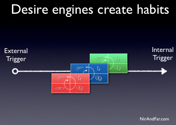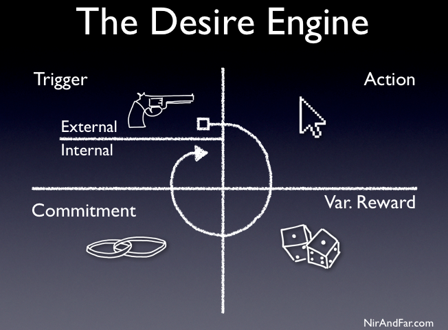 But how do companies create the internal triggers needed to form habits? The answer: they manufacture desire. While fans of Mad Men are familiar with how the ad industry once created consumer desire during Madison Avenue’s golden era, those days are long gone. A multi-screen world, with ad-wary consumers and a lack of ROI metrics, has rendered Don Draper’s big budget brainwashing useless to all but the biggest brands. Instead, startups manufacture desire by guiding users through a series of experiences designed to create habits. I call these experiences “desire engines,” and the more often users run through them, the more likely they are to self-trigger.