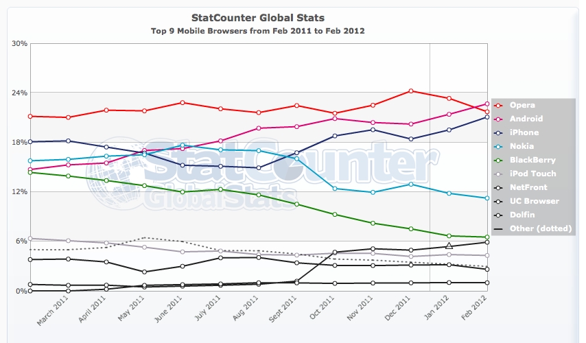 StatCounter found that February 2012 was the first time that the number of phones accessing the mobile web from Android clients had overtaken that of Opera, a non-native browser that was one of the first to hit the market and is used on a range of devices — from lower-end feature phones to Apple’s iPhone (where a user can access it through an app).