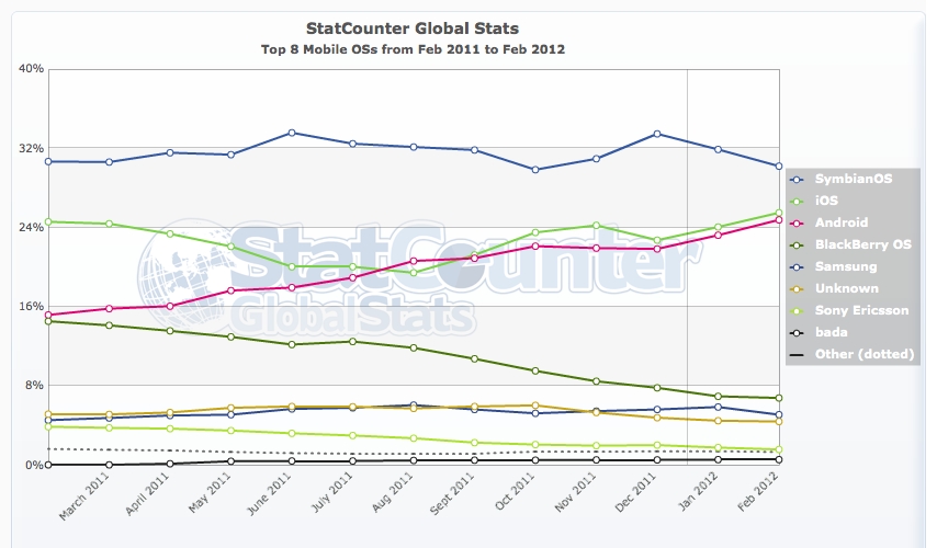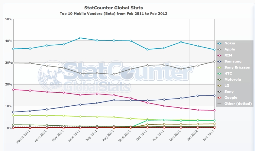 — And when it comes to individual vendors, again, Nokia is still the biggest in actively-used smartphones. In fact, between February 2011 and February 2012, its share has only dropped by about one percent, despite some ups and downs. The next-closest vendor, and you shouldn’t be surprised at all here, is Apple, with just over 30 percent and rising. The closest Android vendor is Samsung, but while it is storming in overall mobile sales, in terms of actively used smartphones, it appears to be at only 14.91 percent.
