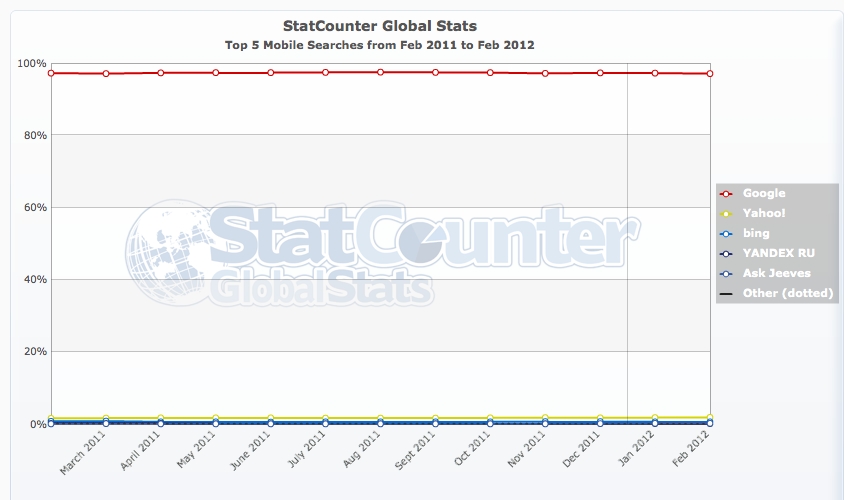 — If you want an idea of just how dominant Google is in mobile search, this graphic pretty much says it all: no one is even in spitting distance of Google’s 97 percent share of the market, and hasn’t been in the last year. Dismal news there for Yahoo, and Bing and all of Microsoft’s mobile efforts there if this is accurate: