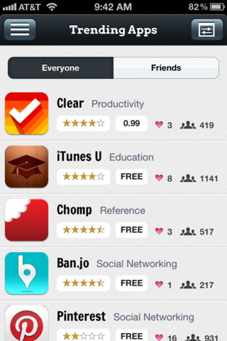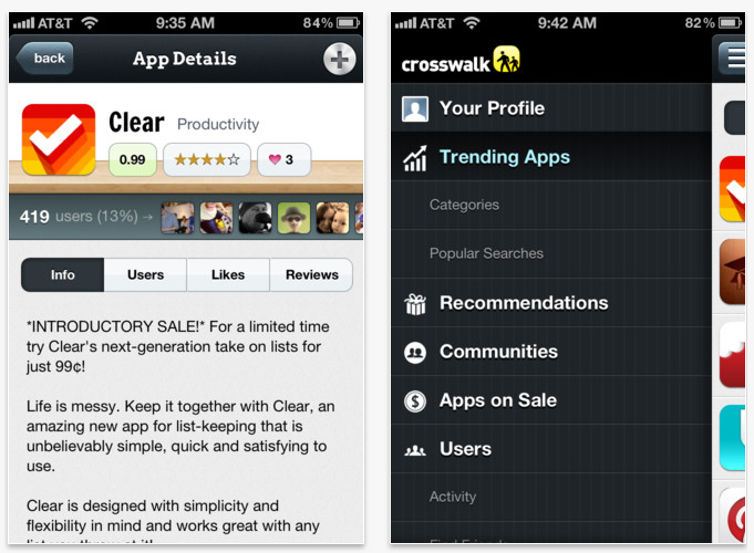 The new mobile version of Crosswa.lk brings real-time feeds of apps trending among your friends plus all those using Crosswa.lk. You can then filter this list by a large set of criteria, such as price, category, community (e.g. photographers, gamers, bloggers, etc.), ratings, most “liked,” and more. You can also use the app to access the various Crosswa.lk communities, or see which apps are on sale and what searches are popular now, find friends, rate apps, and, of course, get your own Genius-like recommendations.